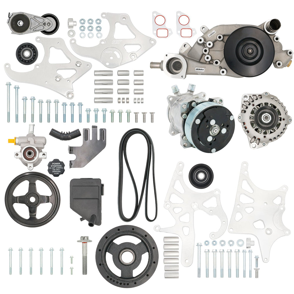This is a comprehensive kit that will include all of the accessory drive components for an alternator, power steering and A/C application in a Corvette balancer spacing. This kit will work with most applications where low engine bay and front accessory drive clearance is needed.