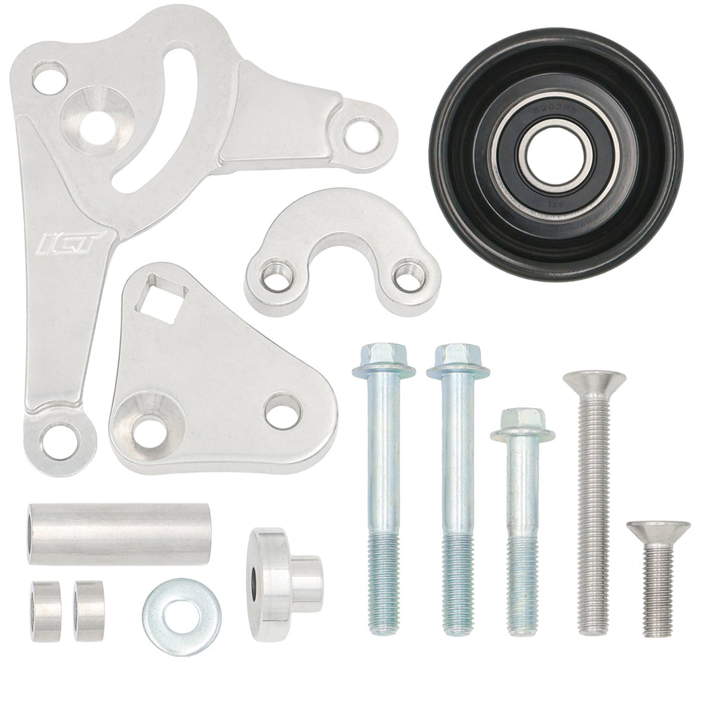 **This can only be used on blocks with at least 2 mounting holes on the front of the block. Blocks that only have 1 mounting hole will require drill template 551445 to drill and tap the 2nd M10-1.5mm hole. This hole is in a non-critical part of the block that is away from the cylinder, oil, and water jackets. This bracket only bolts to the front face of the engine block. Compatible with 790K6 (79.0inch) belt while using 105 amp alternator (ICT# ALT3009) and OEM 1998-02 Camaro power steering bracket or ICT 551751-1.