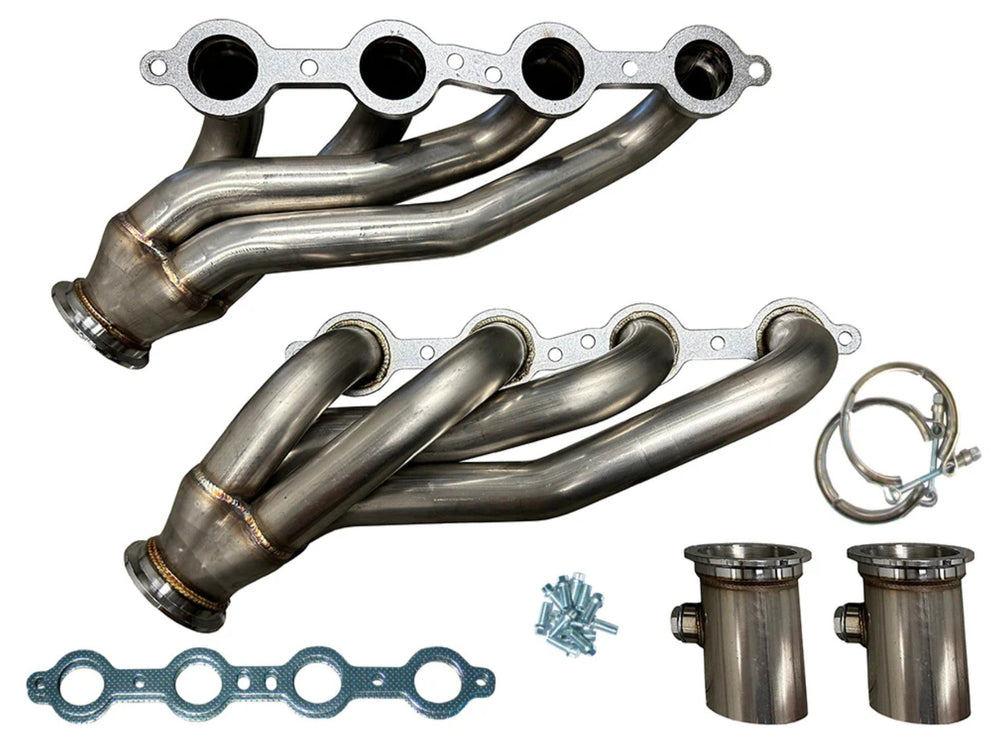 Note: If using a larger 4L80E or older Turbo 350/400 transmission the bellhousing ears may need to be trimmed for proper clearance. These headers are tucked in tight due to narrow older frame clearance. Fits 6, 8, and 10 Speed Auto Transmissions.