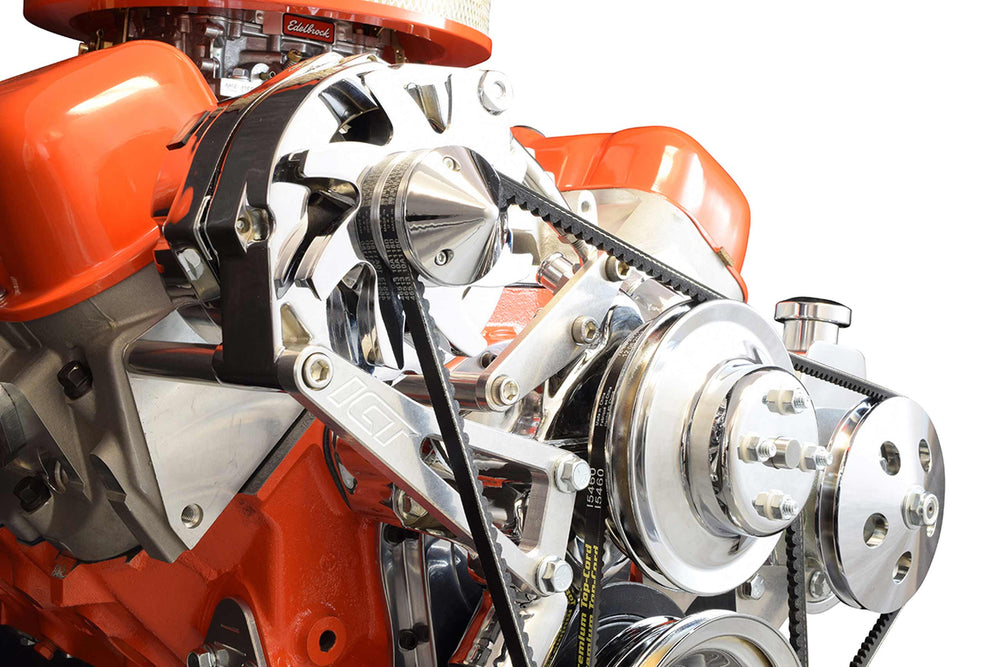 Suggested Power Steering Pump Part # 36P1435 (see photo) Bracket is only compatible with the shown power steering pump style Uses " V-belt for power steering pump (with factory pulley diameters) Uses " V-belt for alternator (with factory pulley diameters) Suggested AC Delco alternator part # 335-1093 Compatible with Chevy alternators with 6.56 inch, center to center bolt holes (12si style alternators) Suggested Crank Pulley Part #14023148 Suggested Water Pump Pulley Part #14023155 Suggested Power Steering Pulley Part #14023173 Suggested Water Pump DWP-442