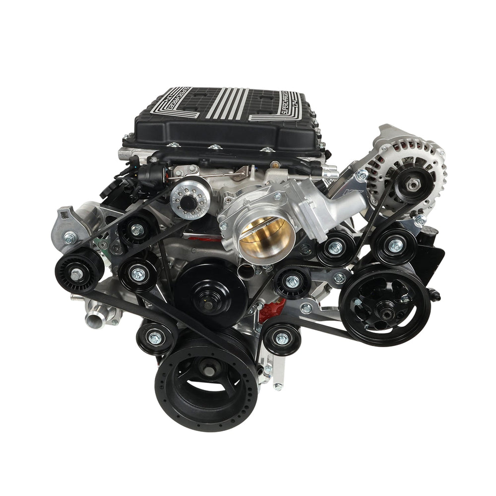 Full kit includes 2 intake adapters, fuel rail mounting bracket, -8orb fuel rails, LS throttle body rotation adapter, LT4 2.5" supercharger pulley and hub, billet gen 4 LS valley pan with oil pressure sensor adapter, and all seals and mounting hardware