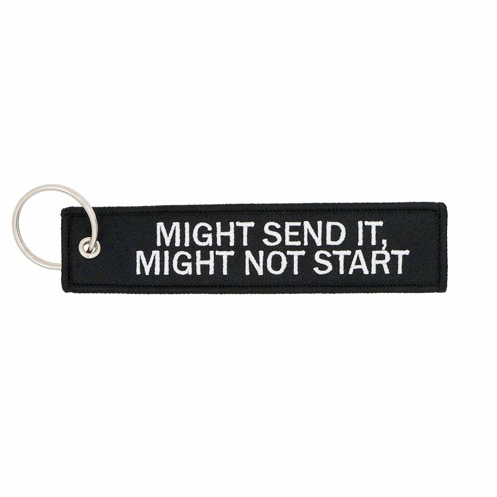 Side 1: embroidered red/black "MIGHT SEND IT, MIGHT NOT START"
