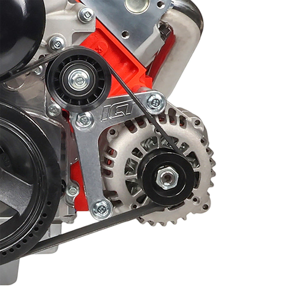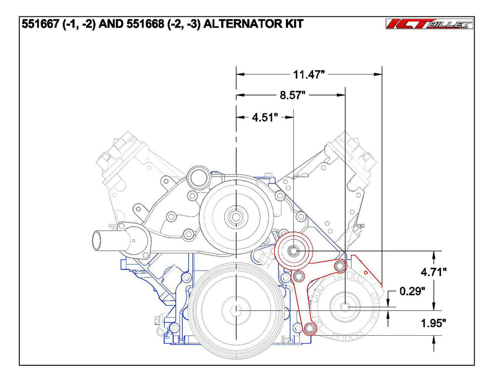**This can only be used on blocks with at least 2 mounting holes on the front of the block. Blocks that only have 1 mounting hole will require drill template 551445 to drill and tap the 2nd M10-1.5mm hole. This hole is in a non-critical part of the block that is away from the cylinder, oil, and water jackets. This bracket only bolts to the front face of the engine block. Compatible with 790K6 (79.0inch) belt while using 105 amp alternator (ICT# ALT3009) and OEM 1998-02 Camaro power steering bracket or ICT 551751-1.