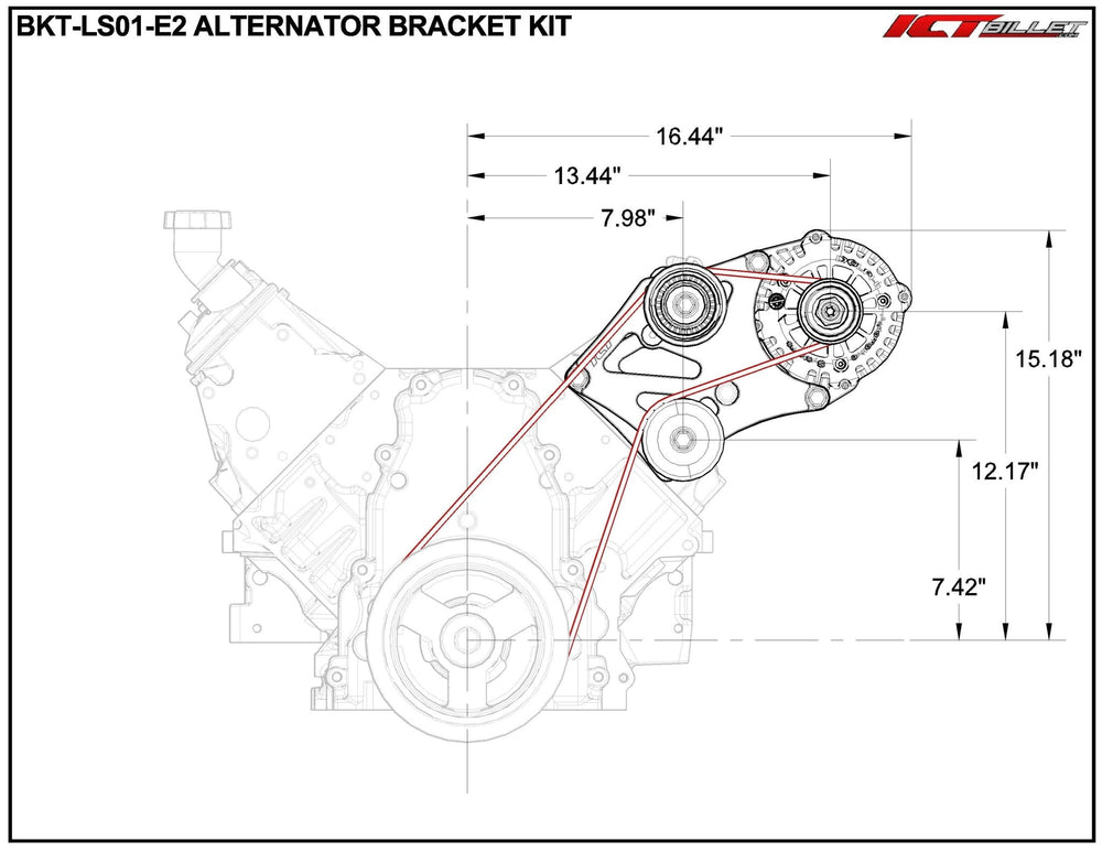 This LS alternator bracket is engineered to mount a truck alternator high on the driver’s side cylinder head—perfect for builds running an electric or remote water pump setup. The integrated manual tensioner maintains proper belt tension without relying on a mechanical water pump for routing. Whether you're using electric water pumps, remote water pump adapters, or ICT’s LS water manifold, this bracket keeps your front drive compact and dependable.
