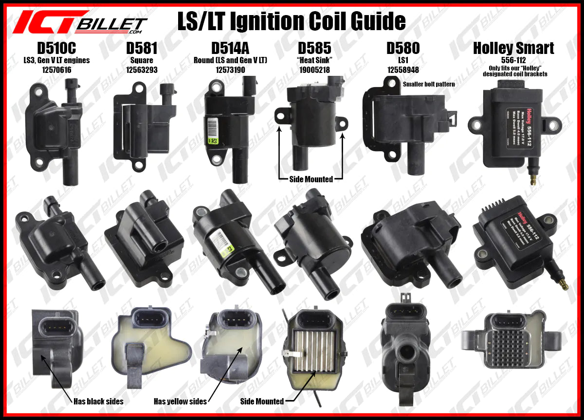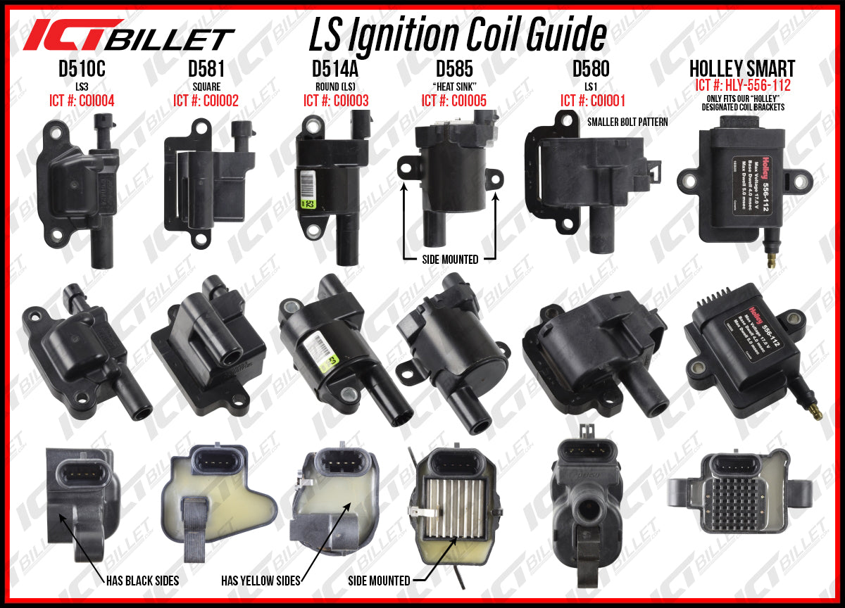 Being able to relocate your ignition coils will open up the top side of the engine for things like our ICT Billet Valve Covers! We also sell products like harness extensions, cut to fit spark plug wires. We make the relocation process as painless and universal as possible. The first thing you need to know is which ignition coils you have, or will need for your swap. Refer to the guide below to identify your coils.