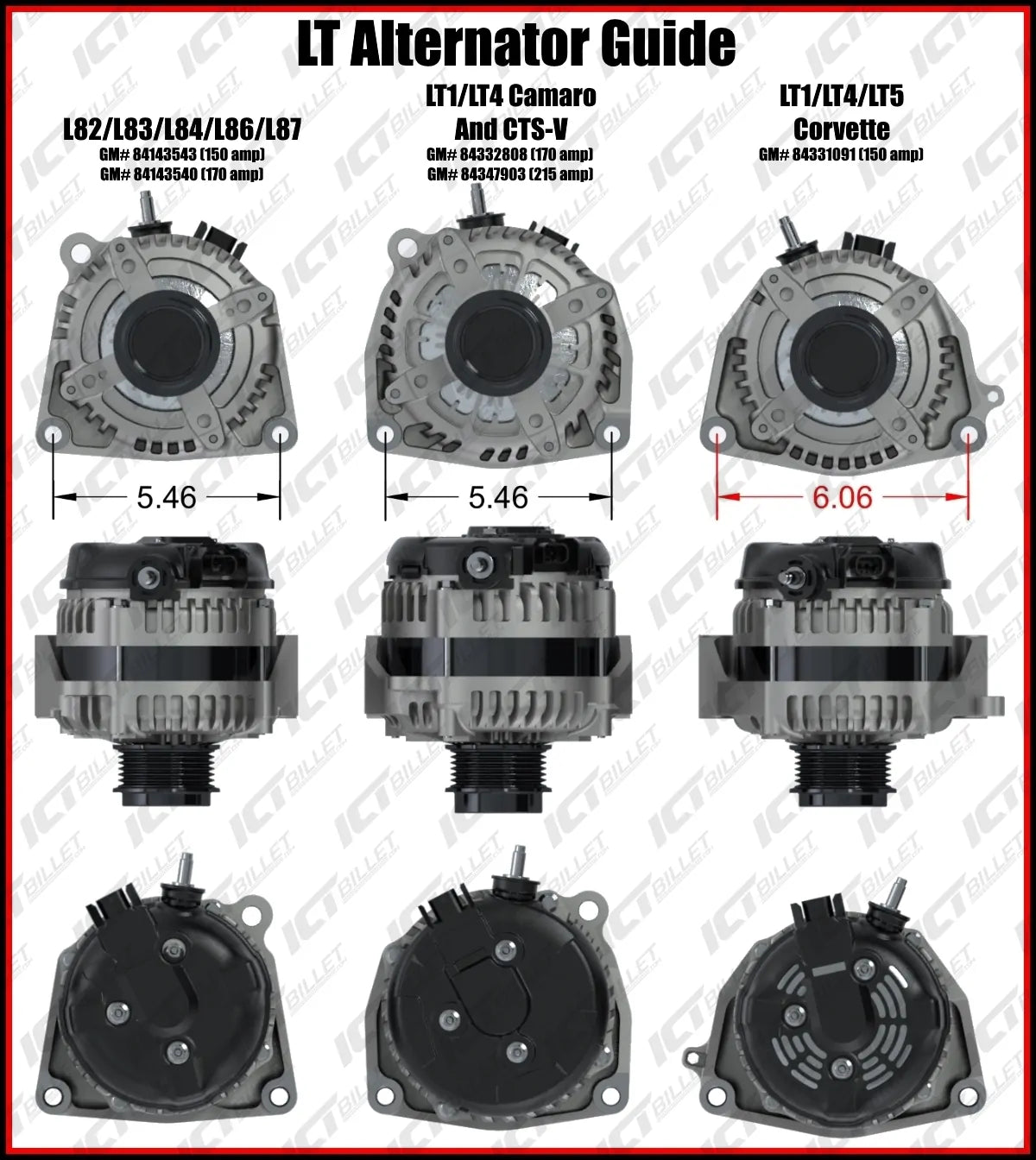 The alternators on the LT based engines offer a very high output compared to the LS based alternators. The LT truck alternator is actually the same size as the LS truck alternator and can be used with ICT Billet brackets designed for LS applications. The outputs very from 150 amp ( L82 / L83 / L84 / L86 / L87 ) to the Camaro and CTS-V ( LT1 / LT4 ) whopping 215 amp