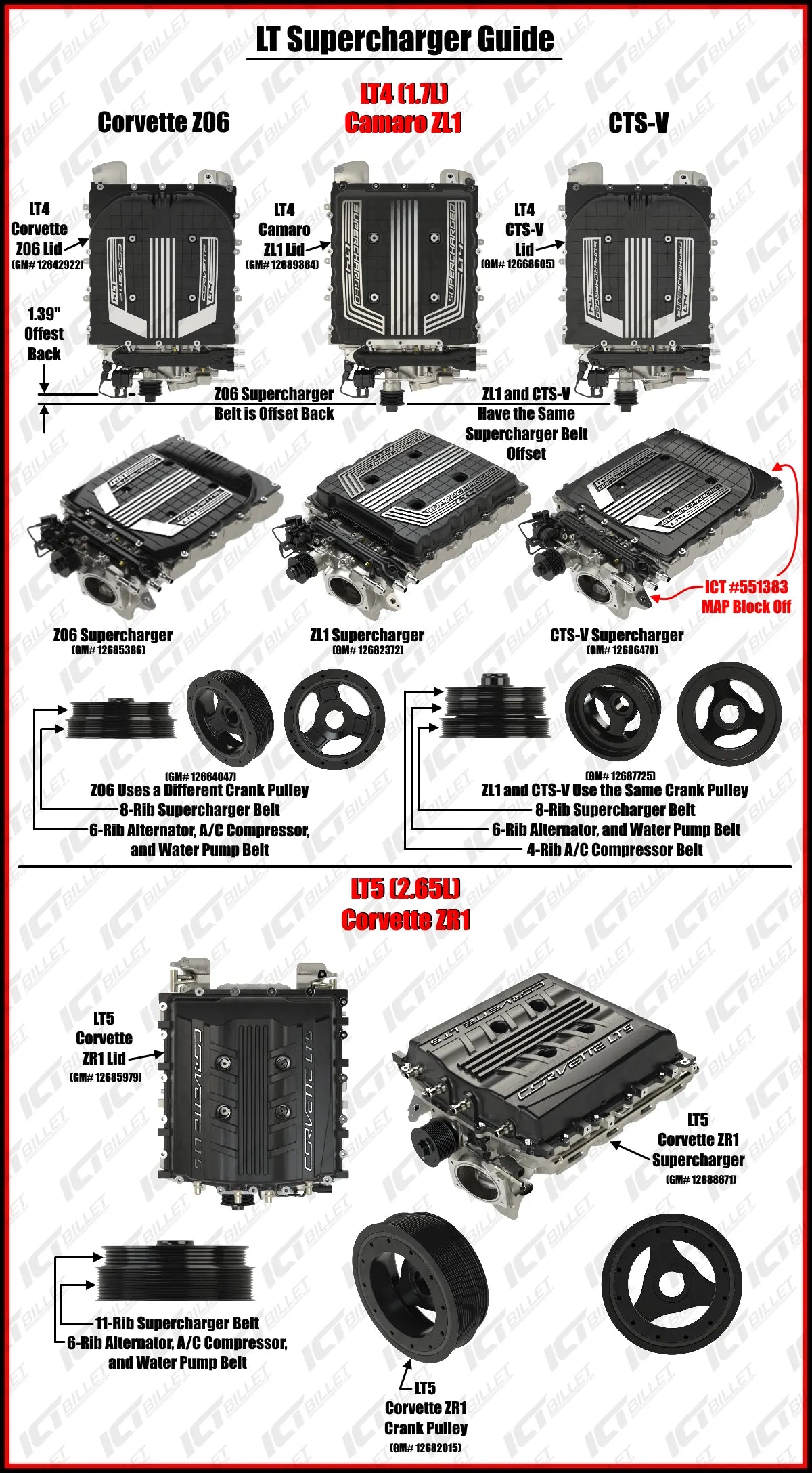The exciting part of any swap is deciding how you are going to power this thing. Either keep it naturally aspirated, or nitrous, or forced induction. The ideas will constantly be tossed around your mind until you settle on one. If you decide to go with forced induction it is easy as ever with the LT4 blowers. The LT4 blower is a 1.7L intake mounted supercharger that comes factory on the Z06 Corvette, ZL1 Camaro, and Cadillac CTS-V. Here at ICT Billet we have made a way to mount these LT4 blowers onto your LT truck engine. The difference is the mounting locations on your heads from the non-supercharged truck block to the LT4 blower. The LT4 off of the Camaro and Cadillac are peferable, they have the proper spacing needed to introduce your blower into the serpentine drive system. The snout on the Corvette blower is recessed. We also have accessory drives that will include the idlers to make sure everything stays tight. Please refer to the guide below for more information and specifications on the LT4 and LT5 blowers!