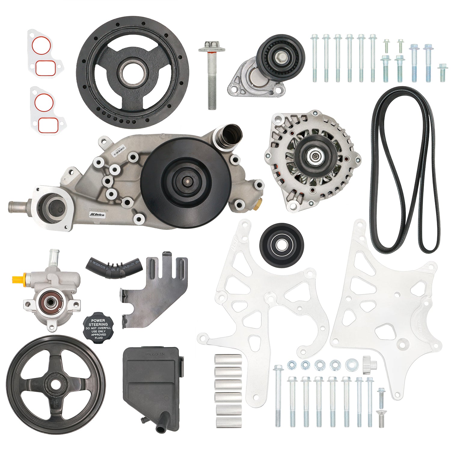 This is a comprehensive kit that will include all of the accessory drive components for an alternator and power steering application in a Corvette balancer spacing. This kit will work with most applications where low engine bay and front accessory drive clearance is needed.
