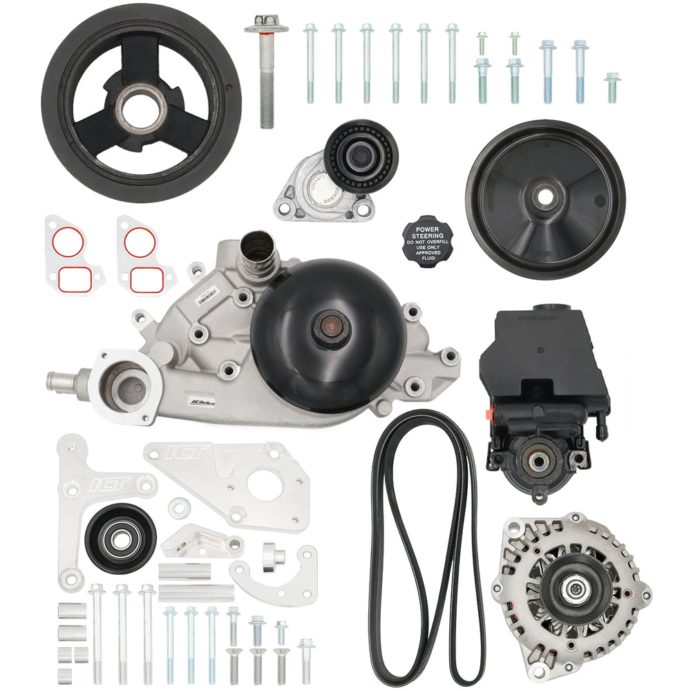 This is a comprehensive kit that will include all of the accessory drive components for an alternator and power steering application in a 1998-2002 Camaro balancer spacing. This kit will work with most applications where up high engine bay and front accessory drive clearance is needed.